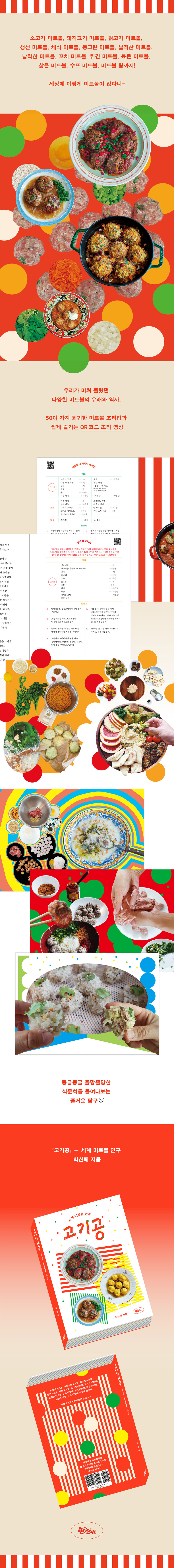 이 책은 우리가 미처 몰랐던 세상 다양한 고기공에 관한 요리책이자 가벼운 연구서다. 친절한 조리법과 조리 영상 QR 코드가 실려 있어 낯설고 먹음직스러운 미트볼을 직접 만들어 즐길 수 있다. 더불어 세계 곳곳 고기공의 역사와 얽힌 이야기, 먹음직스러운 고기공 사진, 화려하고 위트 있는 아트 워크를 보다 보면 어느새 ‘동글동글 올망졸망한 세계’에 빠져들어 동글동글해진 자신을 발견하게 될 것이다.